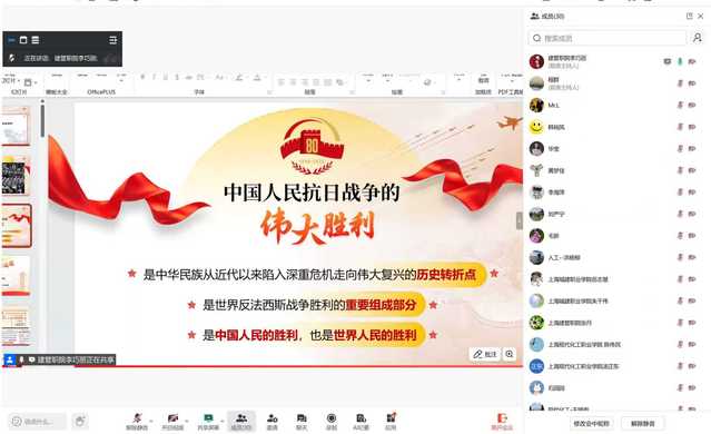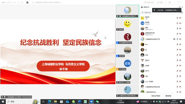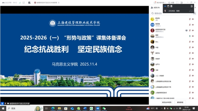 为深化思政课改革创新,落实2025年度上海高校马克思主义学院结对共建任务,进一步推动《形势与政策》课程建设,提升教学质量,11月4日晚,上海城建职业学院马克思主义学院、上海建设管理职业技术学院马克思主义学院与上海现代化工职业学院马克思主义学院携手云端,围绕2025年秋季学期“形势与政策”课第二讲“纪念抗战胜利 坚定民族信念”主题开展集体备课会。通过跨校合作,整合三校优势资源,共同探讨课程教学内容、方法与实践路径,旨在打造标准化教案,开发动态案例库,实现教学资源共享,为学生提供更具针对性与实效性的课程内容,助力思政课改革创新。我院党委副书记、院长李海伟,党委副书记、纪委书记、工会主席华莹,党委委员、副院长李大泽,党委委员、副院长刘宏正,党委委员、副院长程群等领导,与三校共34位教师一同参会。