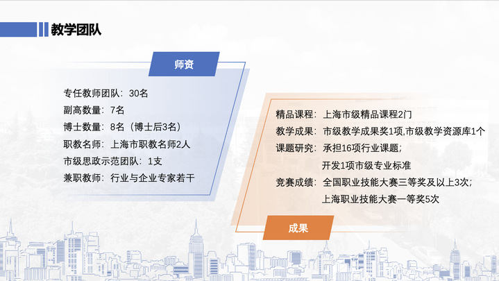 智慧城市管理学院现有专任教师30名,副高7名,博士8名(博士后3名)。上海市职教名师培育2人,市级教学思政示范团队1支,近三年教师及指导的学生获得全国职业技能大赛三等奖及以上3次、上海职业技能大赛一等奖5次,同时还拥有一支稳定的由行业、企业专家组成的兼职教师队伍。